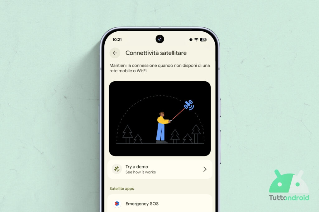 ボックスをタッチすると 衛星という新しいハブにアクセスします。 衛星接続 冒頭で述べたように、これにはデバイスで利用可能なすべての「サテライト」アプリがリストされます。アプリには、緊急 SOS (個人緊急事態)、Google メッセージ、Google Find Hub、Google マップ、システム設定が含まれます。
