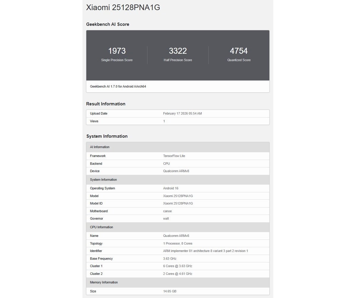 問題のスマートフォンの製品番号は 25128PNA1G で、そのプロトタイプが Geekbench AI データベースで発見されており、そのおかげで、Qualcomm Snapdragon 8 Elite Gen 5 プロセッサ、16 GB の RAM、Android 16 (おそらく Xiaomi の HyperOS 3 インターフェイスを搭載) を搭載できることが確認されました。